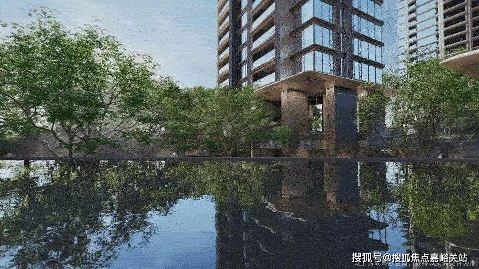 步入社区的第一重仪式感,始于社区整体抬升约1.3-1.4米的“玉盘托珠” 格局。设计师以精妙的地形重塑,将河道景观化为私家长廊,形成天然的视觉屏障与观景台。